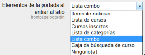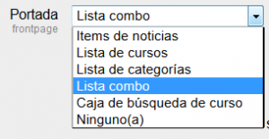 El centro de la portada puede mostrar cualquier combinación de los siguientes asuntos: tems de noticias (novedades), una lista de cursos, una lista de cursos inscritos, una lista de categorías de cursos, una lista de categorías y cursos, una caja de búsqueda de cursos, o ninguno de estos. El orden está determinado por una caja de combinación.