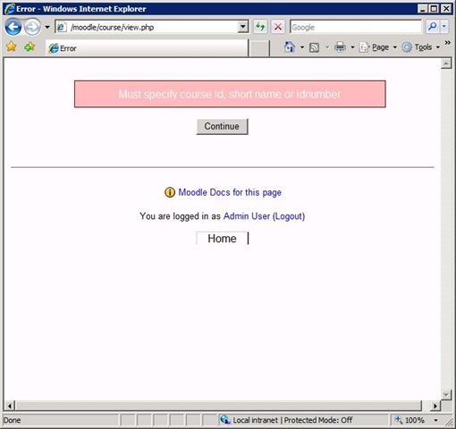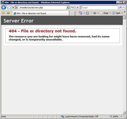 But when you're diagnosing problems in Moodle that's not very useful. You can temporarily disable these default error messages in IIS so that you see a specific Moodle error message. To achieve that set the "existingResponse" setting for Custom Error Pages in IIS to “PassThrough” for your Moodle site. The result will be that Moodle displays a more specific message about the error when a problem occurs: