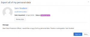 A partir de Moodle 3.9 en adelante, las solicitudes de eliminación y exportación de datos pueden ser aprobadas automáticamente, en lugar de que el oficial de privacidad tenga que aprobar manualmente cada una. Esta característica puede ser habilitada en Administración del sitio / Usuarios / Privacidad y políticas / Configuraciones de privacidad.