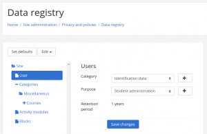 El OPD puede configurar propósitos (el porqué la organización está procesando datos) con períodos de retención y categorías para datos almacenados en Moodle en el registro de datos. Different types of data may need to be stored for different lengths of time. For example, student submissions to an assessment may need to be retained indefinitely to be able to provide evidence of student accomplishments, whereas general coursework such as forum posts might only be retained until graduation + 12 months.