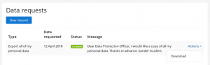 Si el usuario ha solicitado una copia de todos sus datos personales, una vez que la solicitud sea a´probada, recibirá una notificación para informarle que sus datos personales pueden ser descargados desde la página para solicitar sus datos. A partir de Moodle 3.5.2 en adelante, el usuario tiene por defecto una semana para descargar sus datos antes de que expire el enlace para descarga. (Un administrador puede configurar un tiempo de expiración para la solicitud de datos en las 'Configuraciones de privacidad' en la Administración del sitio).