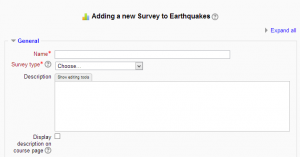 Después de Activar la edición, en la sección en donde Usted desea añadir su encuesta, haga click en el enlace para "Añadir una actividad o recurso" (o, si ese enlace no estuviera presente, haga click en el menú emergente de "Añadir una actividad") y elija Encuesta predefinida. Todas las configuraciones pueden expanderse al hacer click en el enlace para "Expander todo" arriba a la derecha.