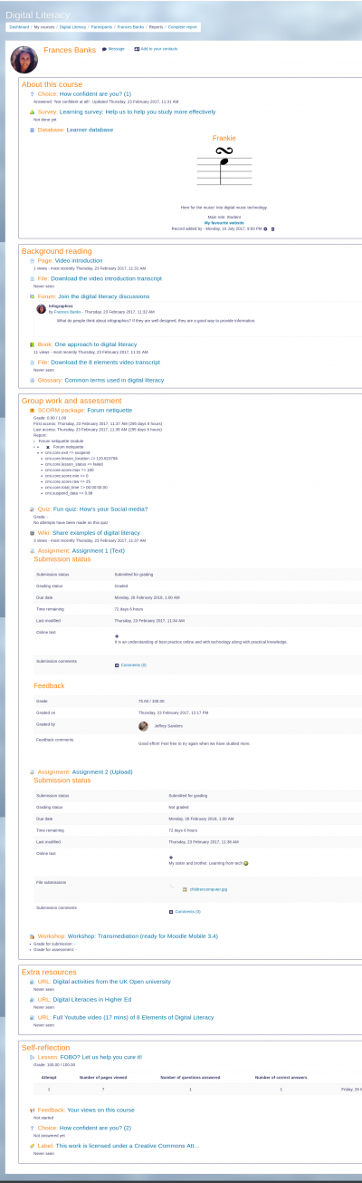 El reporte completo le ayuda a los instructores a ver una lista detallada de la última bitácora y actividad de un estudiante individual en las actividades y recursos en su curso Moodle, incluyendo la contribución detallada a cualquiera de los diferentes tipos de actividades del curso. Las actividades y recursos están mostradas en el mismo orden en el que están en la página principal del curso. Se podría parecer a un portafolio del estudiante en un curso específico.
