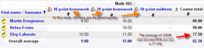 En algunos cursos, el número de puntos (o marcas) a un determinado elemento es arbitrario y su peso no es un factor relevante el cálculo de las calificaciones del curso. En este caso, cada tarea tiene el mismo peso, por lo que un tarea de 10 puntos puede ser tan significativa como una tarea de 20 puntos. Con esta estrategia de clasificación, en primer lugar se realiza una conversión de cada elemento a su porcentaje y, a continuación, se calcula el promedio de los porcentajes totales del curso.