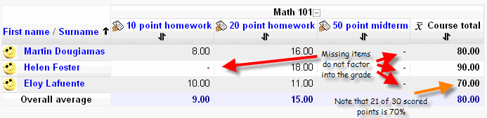 Por defecto, Moodle calcula las calificaciones de un curso sobre la base del número total de puntos (o marcas) que obtuvo, dividido por el número de puntos posible. Por lo tanto, si el curso tiene dos pruebas en mitad del curso o parciales, cada uno por valor de 50 puntos, y un examen final con un valor de 100 puntos, el examen final cuenta como el doble que cada una de las pruebas de mitad de período o parciales.