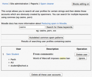 - Use nuestro reporte limpiador de publicidad chatarra en Administración del sitio > Informes > Limpiador de publicidad chatarra para localizar las cuentas de usuarios responsables de la publicidad chatarra y otras cosas feas, para que le ayude a eliminarlas. Además de las descripciones del perfil de usuarios, ésto busca las palabras clave (spam) en comentarios, publicaciones en blogs, y mensajes.