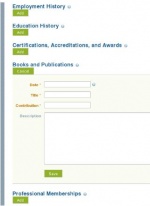 A continuación, “My Resumé” es la sección que podríamos considerar equivalente a un Curriculum Vitae. Y en ella el usuario podrá incluir tanto la información personal como la información relativa a su actividad formativa, laboral, etc. Esto podrá hacerlo, según el caso, en áreas de texto libre (Cover Letter e Interest) o mediante formularios predefinidos para “Employment History”, “Education History”, “Certifications, Accreditations, and Awards”, “Books and Publications” y Professional Memberships