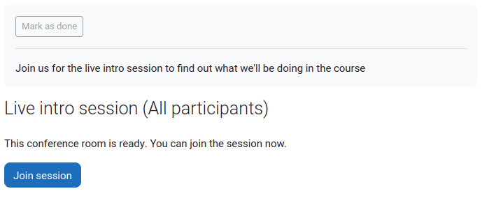 - Una vez configurada, la actividad aparece con un enlace para unirse cuando la hora sea correcta (Antes de ésto, o si un moderador fuera requerido con anticipación, un mensaje aparece diciendo que la conferencia todavía no ha comenzado.)