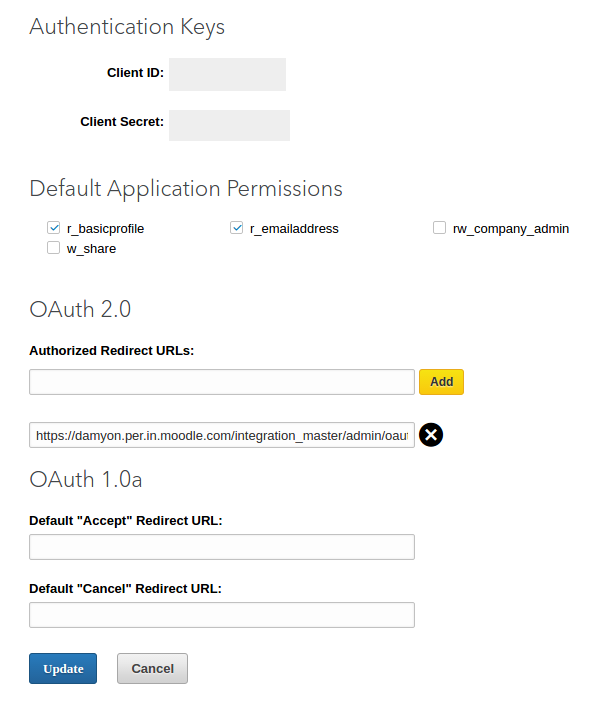 Habilitar los permsos r_basicprofile y r_emailaddress e ingresar la URL de redirección autorizada OAuth 2. Esta es la URL de su sitioseguida por /admin/oauth2callback.php (por ejemplo, para un sitio Moodle de https://teach.me/moodle/ la callback url debería de ser https://teach.me/moodle/admin/oauth2callback.php).