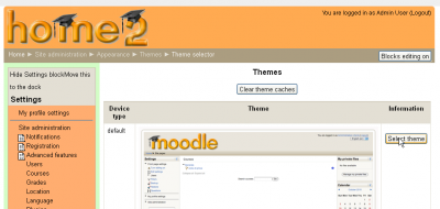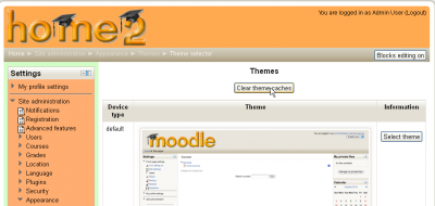 En este ejemplo, nosotros cambiaremos el tema de nuestro sitio a uno nuevo que hemos añadido. Su rol requerirá los permisos que le permitan a Usted cambiar los temas. Recuerde que los temas pueden cambiarse en muchos contextos en Moodle.