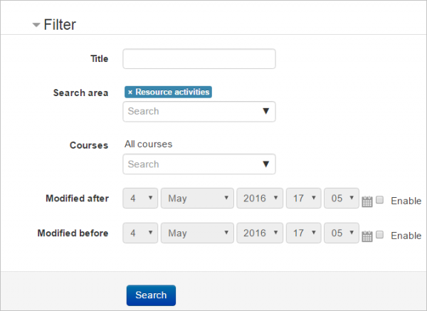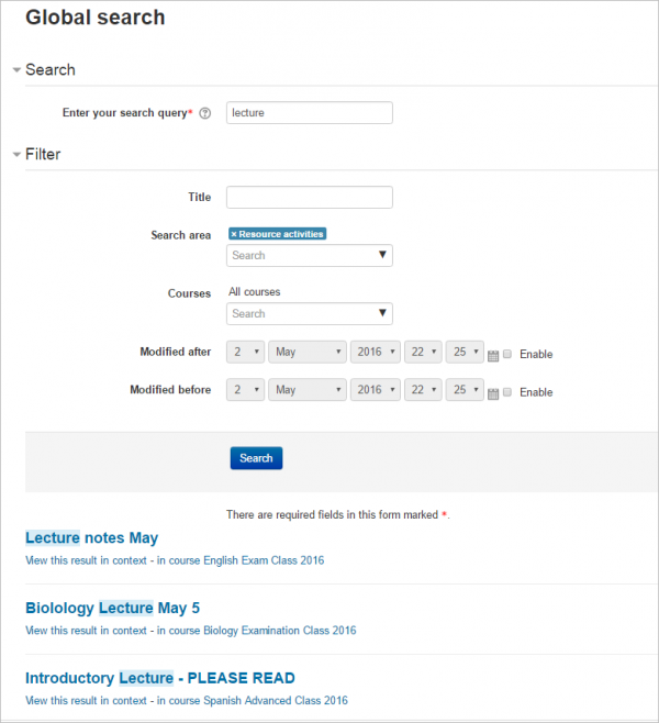 - Búsqueda global le permite a Usted buscar en todas partes en el sitio Moodle al que Usted tenga acceso. Un estudiante puede buscar en sus cursos algunas notas (apuntes) de curso, por ejemplo; o un profesor puede buscar actividades relacionadas con algún asunto.