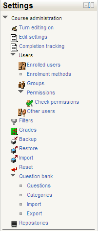 | Existe documentación diferente para varias versiones de Moodle: Esta página corresponde a la traducción de https://docs.moodle.org/19/en/Course_administration_block y es documentación para Moodle 1.9 y anteriores. Si Usted desea ver la documentación reciente para Moodle 2.x, vea Bloque de administración. |