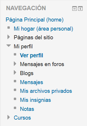 Mi perfil es un enlace en el Bloque de navegación que se expande para permitirle a los usuarios acceder a ciertos elementos de su perfil en Moodle.