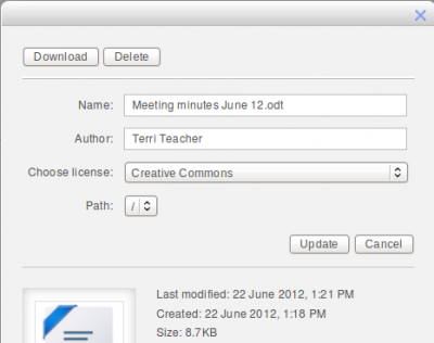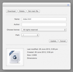 - Clicking on the name of an uploaded file opens up a pop up dialogue box which allows file details quickly to be altered.