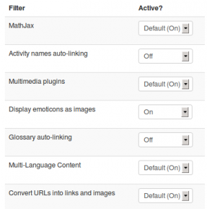 - Seleccionar 'Activado' (siempre disponible para todos los cursos), 'Desactivado, pero disponible' (los profesores pueden elegir si quieren o no habilitar el filtro para el curso o la actividad) o 'Deshabilitado' (siempre desactivado para todos los cursos) tal como seaa necesario para cada filtro.