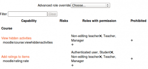 Vea https://docs.moodle.org/22/en/Permissions (Moodle 2.2) https://docs.moodle.org/37/en/Permissions (Moodle 3.7)
