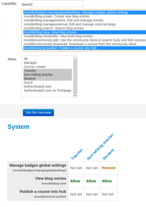 El reporte le permite al administrador seleccionar una capacidad y uno o más roles. El reporte mostrará el rol y su nivel de permiso para dicha capacidad; y si dicha capacidad estuviera anulada para el rol en el sitio. Por ejemplo: podría mostrar que la capacidad 'gradereport:user view' estuviera configurada a nivel de sitema como "Permitir" (Allow) y para el Curso 1 estuviera configurada a "Prohibir" (Prohibit).