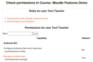 The check permissions feature provides a method to view all roles both in the current context and higher contexts (in Moodle 2.3.2 onwards) and capabilities for a selected user based on their role assignments. These capabilities determine whether or not the selected user is allowed to perform associated tasks within the system or course.