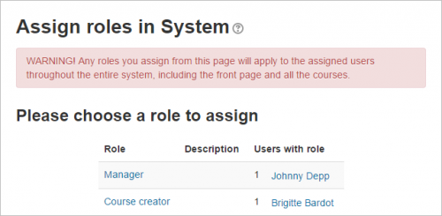 Cualquier rol asignado aquí se aplica a todo el sitio. Tiene sentido, por lo tanto, que solamente puedan ser asignados quí aquellos roles que necesiten esta funcionalidad. El Rol de Mánager y el Rol de creador de curso son ejemplos de dos de estos roles. El asignar aquí a un estudiante o profesor resultaría en que ellos podrían estudiar/enseñar en todos y cada uno de los cursos del sitio, cosa que usualmente no es deseable.