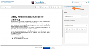 Con los envíos de texto en-línea, si el profesor configura “Comentarios en-línea” a ‘sí’ entonces los profesores podrán proporcionar retroalimentación a los envíos de los estudiantes directamente en una de dos manera: