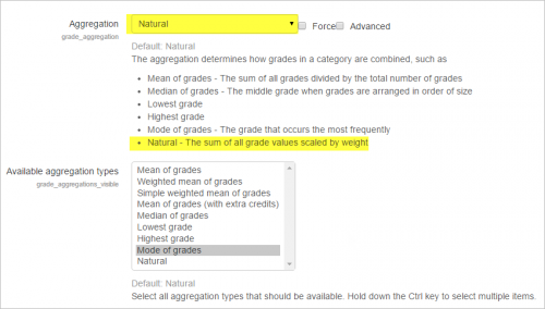 Existen 2 casillas de selección junto a la mayoría de las características en esta página. La casilla de "Forzar" elimina las opciones que pudiera ver el profesor. Por ejemplo, el profesor solamente verá y podrá usar el "promedio de todas las calificaciones" como una agregación. La casilla de "Avanzadas" ocultará la característica especificada hasta que el botón para "Mostrar avanzadas" sea usado por el profesor. Esto reducirá las opciones iniciales para los profesores, pero les permitirá verlas si así lo desearan.