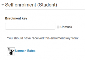 A menudo se usa una clave de inscripción como un método simple para que alguien más, diferente al profesor, determine si un estudiante en particular puede inscribirse a sí mismo al curso. La idea es que una o más personas le darán la clave del curso, sólamente a las personas autorizadas para que tomen dicho curso. A veces, esta distribución es mediante un Email privado, una carta postal, por teléfono, o inclusive. verbalmente en una reunión cara-a-cara, como podría ser en una clase tradicional o una oficina de un asesor..