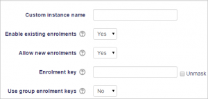 - En Moodle 2.6 y superiores los íconos tiene un aspecto diferente, pero funcionan igual. Observe que en la pantalla siguiente la clave de inscripción tiene Personalización del idioma y muestra '¿# de grupo?', lo que es más amistoso para los estudiantes de una escuela con muchos grupos: