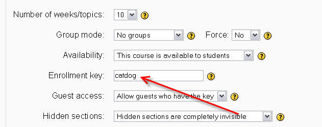 A menos que usted quiera que el mundo entero se matricule en su curso (posible, pero usualmente no es el caso), no deje en blanco el campo de clave de acceso (enrollment key) del curso variables. Con esta clave todos se mantendrán fuera, a excepción de sus estudiantes.