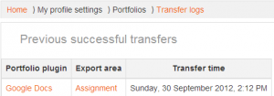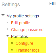 Mientras que el administrador determina cuales portafolios están habilitados en el sitio en Gestionando portafolios, aun usuario individual puede elegir cual portafolio mostrar o tener oculto desde Configuraciones > Configuraciones de mi perfil > Portafolios > Configurar y puede ver el registro de todos los ítems exportados desde Configuraciones > Configuraciones de mi perfil > Portafolios > Bitácoras de transferencia