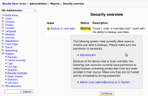 Moodle incluye una característica que permite que los respaldos de curso incluyan datos de usuarios (tales como publicaciones en foros, entradas del glosario y otras). Para hacer ésto,Moodle incluye también las cuentas de usuario relevantes, para que se mantenga la consistencia de los datos cuando se restaure el respaqldo en un sitio Moodle diferente. Desafortunadamente, en las manos equivocadas, esta característica también puede causar una fuga de privacidad y una posible explotación del sitio original completo.