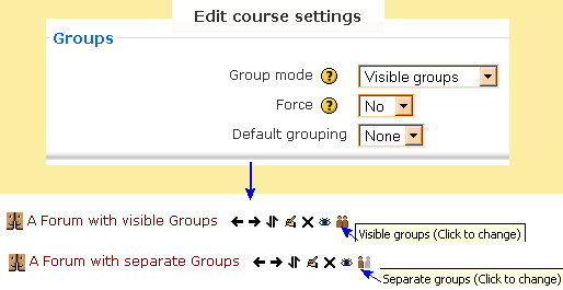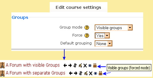 The above example shows the group section in the course settings and part of a course. The teacher wants the default activity group setting to be "visible" but has not "forced" this preference on all activities. This is show by the two forum activities, where one shows the visible group icon and the other the separate group icon.