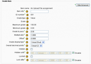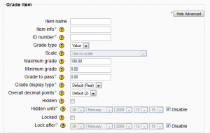 Estos ítems de calificación son creados manualmente por medio de la página para "Editar Categorías e Ítems". El botón para "Añadir ítem de calificación" es seleccionado y aparecerá el siguiente formato. Aquí están disponibles varias opciones, que normalmente son llenadas de forma automática por el módulo de actividad que crea el ítem de calificación basado en la actividad: