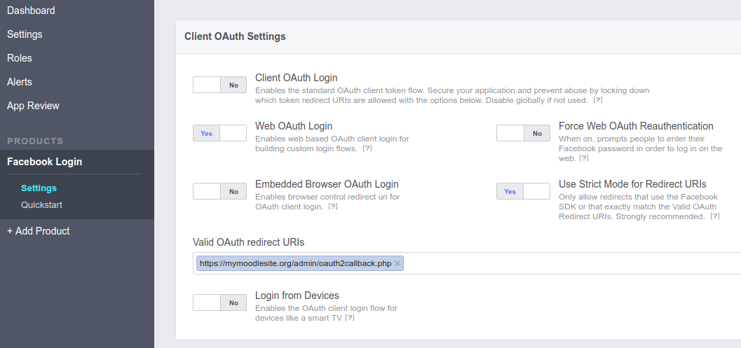 6. Haga click en Configuraciones debajo de 'Ingreso Facebook (Facebook Login)' a la izquierda y después configure las configuraciones de Cliente OAuth como sigue: