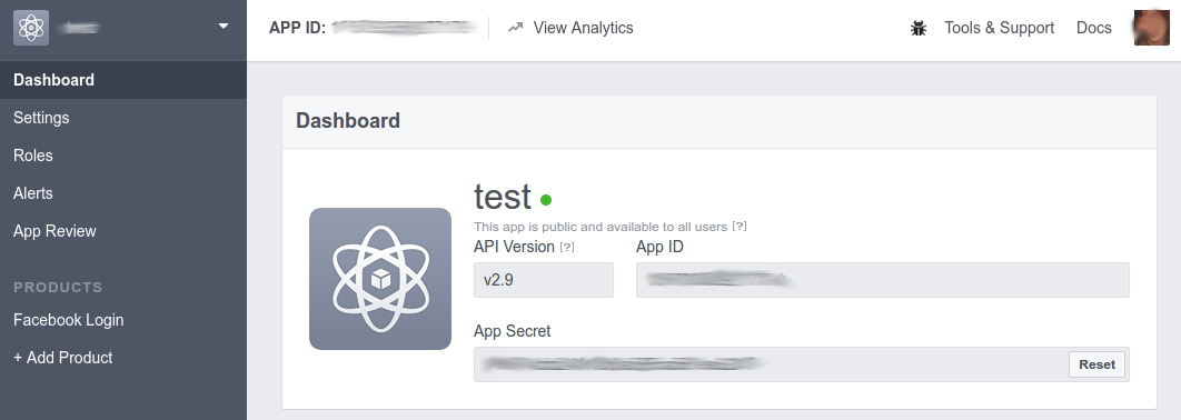 Finalmente, haga click en el Tablero (Dashboard) a la izquierda, obtenga la App ID y el App Secret e ingréselos en Moodle como el secreto y la ID del cliente.
