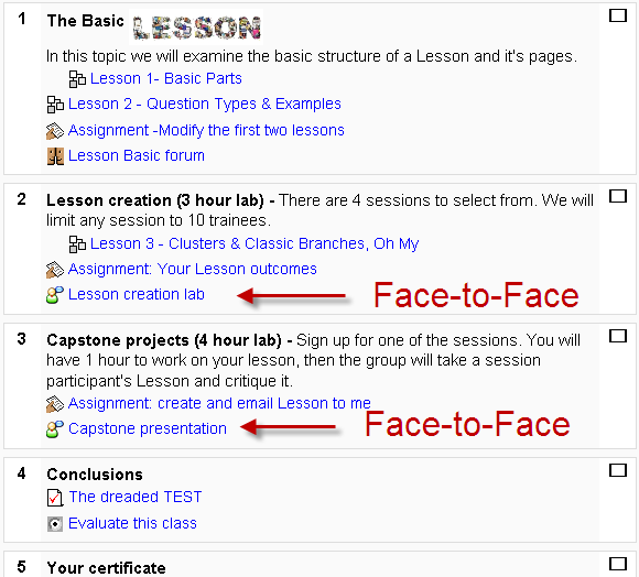 - Topic 3. This is the Capstone. Here they take the work they started in the first lab and expand it. In a smaller face-to-face sessions they will get a chance to see and critique other trainee's lesson. The instructor will post all assignments for everyone to see and download.