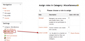 The role of cohort enroller may be given to a regular editing teacher to allow them to enrol category cohorts into their course.