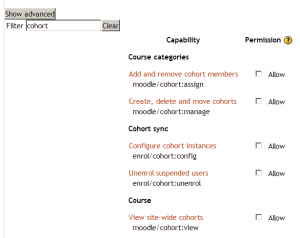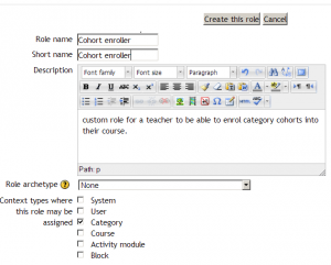This custom role will permit teachers to enrol category cohorts into their course. This means therefore that a Head of Science Faculty could enrol cohorts for Biology, Physics and Chemistry courses while not having access to cohorts from other faculties.