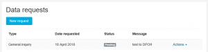 Esta página le permite a un usuario ver y crear solicitudes de daatos. El estado de cada solicitud es mostrado, aun después de que haya sido cumplimentada.|