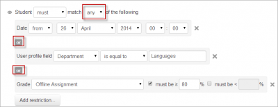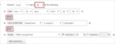 Further restrictions may be added by clicking the 'Add restriction' button again, and it is possible to specify that ALL the conditions or ANY of the conditions are required before the activity is made available. Thus, it is possible to use 'Or' as well as 'And' conditions. See Usando restringir acceso for an example.