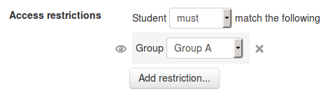 Para poder restringir una actividad, recurso o tema/tópico de curso, debe estar habilitado el Restringir acceso. Esto resultará en una sección para 'Restringir el acceso' en las configuraciones de la actividad, recurso o tema/tópico, y allí puede añadirse una restricción por grupo.