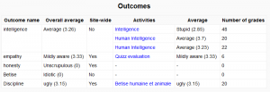El informe de los resultados ayuda al profesorado a hacer el seguimiento del progreso en los resultados de los estudiantes. Lista los resultados a nivel de sitio y los resultados personalizados usados en el curso actual, su media global (cada resultados se puede medir a partir de muchos elementos), los valores promedio de cada elemento y el número de "calificaciones" dado por cada elemento.