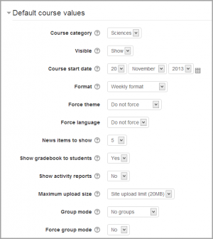 - Si Usted está creando varios cursos que emplean la misma plantilla, y desea que todos tengan las mismas configuraciones, Usted puede especificarlas en la sección acerca de 'Valores por defecto del curso'.