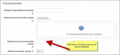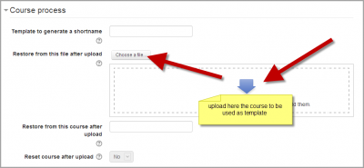 - Haga una pre-visualización y baje hasta donde dice 'Proceso del curso'. En la caja 'Restaurar desde este curso después de subir', añada el nombre corto de su curso plantilla.