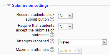 Nota: Esta página describe las configuraciones para el nuevo módulo de Tarea de Moodle 2.3 en adelante. Para la documentación acerca de configuraciones para Tareas (2.2), vea Assignment settings en la documentación en Inglés para Moodle 2.2.