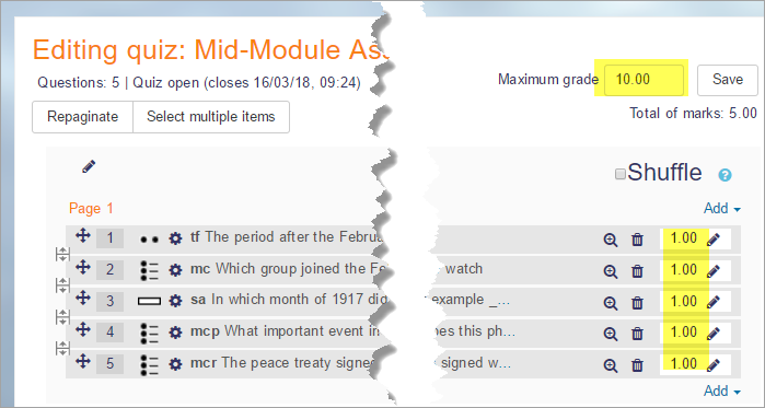 - Precaución: En algunas versiones de Moodle, si usted usa esta pregunta en otro examen, esto podría potencialmente cambiar también la pregunta en ese otro examen. Un truco es cambiar el puntaje a 0 y recalificar el examen recién contestado. Esto establecerá la nueva calificación para el Libro de calificaciones. Ahora regrese y cambie de vuelta el puntaje a su valor original.