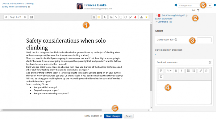 - Here, the submission may be annotated (1) and/or downloaded (2); a grade entered (3) and individual feedback given (4). The teacher saves the changes (5) and moves to the next student (6)
