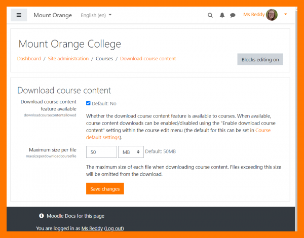 Este proyecto de la Asociación de Usuarios de Moodle le permite a los administradores hacer una característica para descargar contenido del curso disponible para que los profesores la ofrezcan en los cursos.