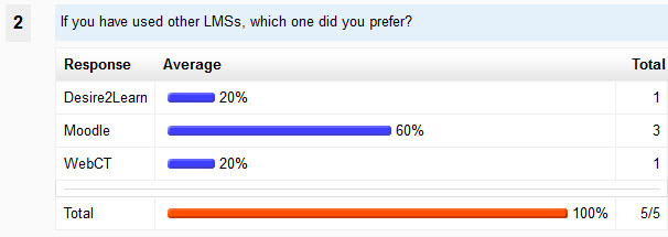 This screenshot shows for instance that the Forum and Glossary activities are favoured by 4 respondents (out of 5 who responded), accounting for 27% of the choices each.