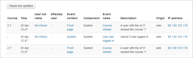 Las bitácoras en vivo están disponibles para un curso desde Administración > Administración del curso > Reportes > Bitácoras en vivo y para el sitio (como se muestra en la pantalla inferior) desde Administración > Administración del sitio > Reportes > Bitácoras en vivo